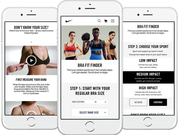 Overview | Finding the right sports bra is foundational to the success of any female athlete (professional or amateur) and yet most experiences online make finding the right the sports bra at best an afterthought and at worst a painful experience. The Nike Women’s team came to us to help them reimagine their online bra experience and create a digital platform that smoothed out the process to finding the perfect support.